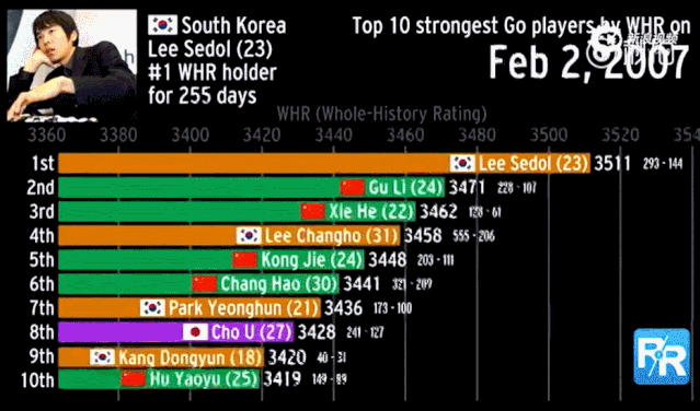 前几年AlphaGo横扫棋坛的时候,有个很火的关于“世界围棋历史排名前十棋手”的视频,根据西方某个网站收录的世界棋坛历代棋手的成绩,展示了从1975年以来排名世界前十的棋手的历史变化。
