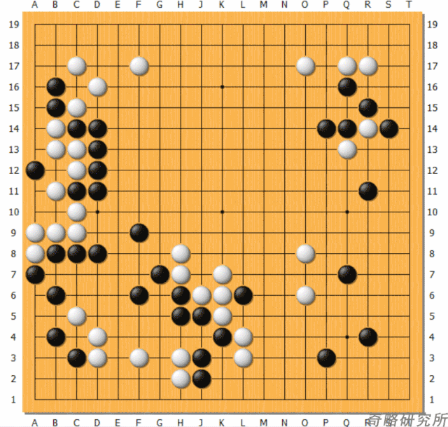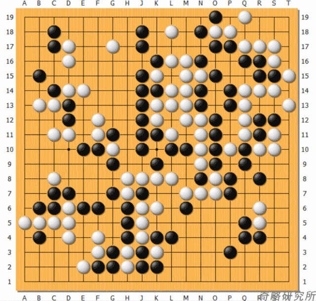如上图,李世石的白棋因形势不佳而冒险脱先,古力黑157、159直接破眼,将白棋绵延上下的大龙屠杀,获得完胜。