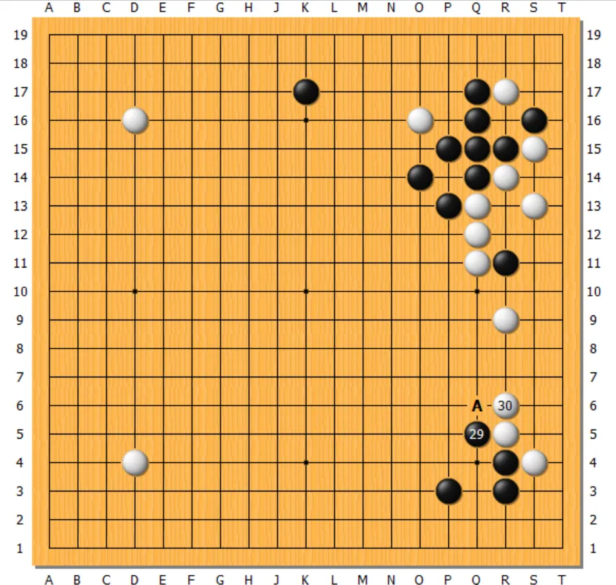 但AI认为白棋胜率也就58%,和开局一样。更有趣的是,AI认为白棋30应该下在A位连扳,如此则胜率将升至61%。