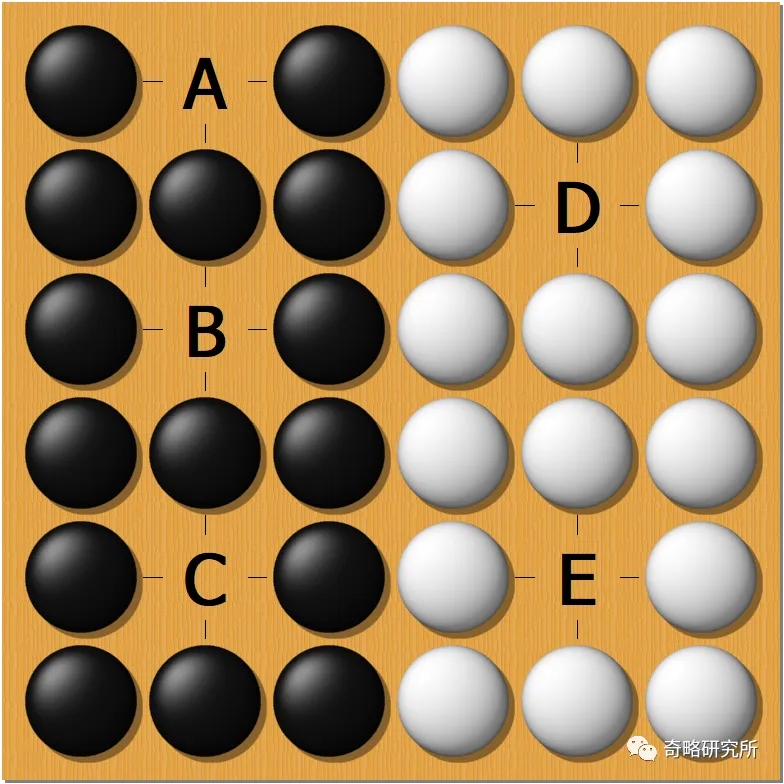 为了简化问题,我们假设棋局的胜负完全取决于中央白棋那条长长棍子的生死(因为白棋长棍的生死确实攸关胜负,所以此假设是合理的)。