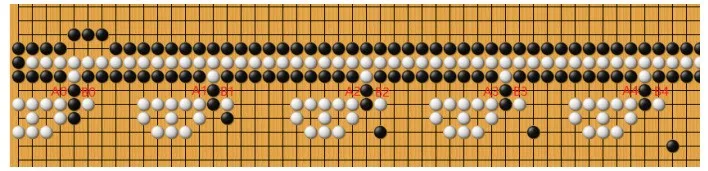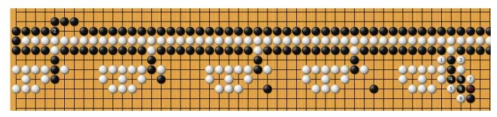 这个局面,黑棋的铁壁包围着白棋中央向右方无限延展的长棍,而白棋的长棍只有三口气。长棍上每隔十个棋子就有一处“突触”。