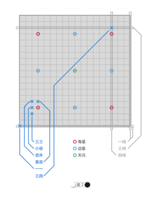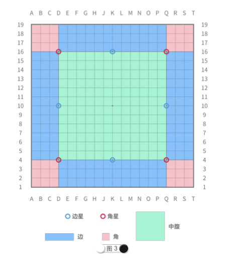 找到适合自己的入门路径是什么体验? 简明围棋入门:10 分钟教你快速学会围棋 第 1 步:落子在交叉点上第 2 步:棋子的气 在开始下一盘棋之前,我们首先要知道什么? 围棋的道具包括棋盘和棋子。 棋盘是由数量相等的横线和竖线交叉形成的方格阵。棋盘尺寸根据线 的数量决定。 常见的棋盘尺寸有 9x9、13x13 和 19x19,分别称为 9 路棋盘、13 路棋盘和 19 路棋盘。9 路和 13 路棋盘通常用于初学者练习和小型娱乐 赛事,一般赛事均使用 19 路棋盘。 棋盘上的点和线 棋盘上的交叉点由横线和竖线交叉形成。棋子要落在交叉点上。 特殊的交叉点及名称: 星位:棋盘上用圆标识的黑色交叉点。 天元:棋盘正中央位置的交叉点。 小目:三 四点又称为小目。 线:棋盘上的线,从平行且最近的棋盘边缘开始数,数到几就是几线。 棋盘上的区域 19 路棋盘上的区域如图 3 所示: 角:角星和棋盘角落内的区域。 边:两个相邻角星之间,从一线到四线的区域。 中腹:四颗角星之间围成的区域。 我们在这里简介棋盘区域,未来在第三章会更加详细的介绍棋盘各个 区域的不同之处与特点。 棋子 棋子为扁圆形,分为黑子和白子。19 路棋盘配 181 颗黑子和 180 颗白子。